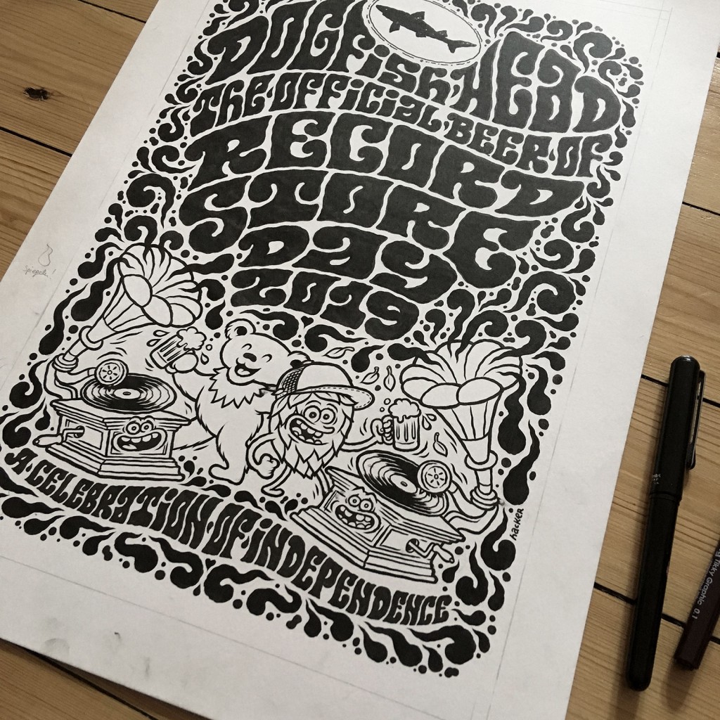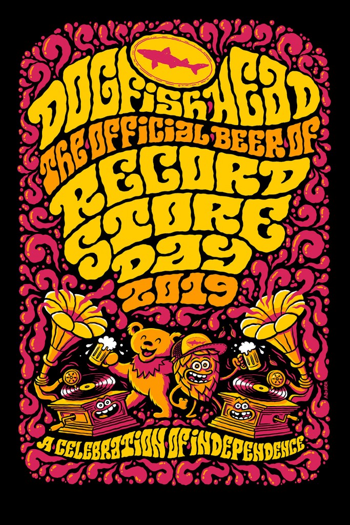 For the fifth time Dogfish Head is the official beer of Record Store Day. I’m stoked that I was asked again to do a poster for this occasion! And this one even glows in the dark!