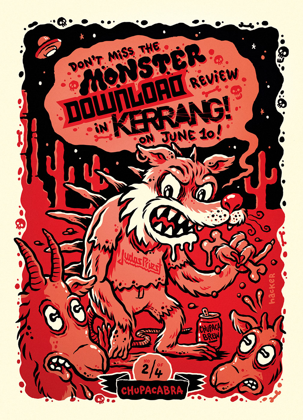 Michael Hacker Kerrang! post cards Michael Hacker Kerrang! post cards for Download festival review showing a chupacabra with a Judas Priest shirt